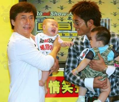 Hong Kong movie star Jackie Chan(L) and Louis Koo carry babies during a news conference to promote their new movie 'Rob-B-hood' in Hong Kong August 1, 2006. (Reuters)