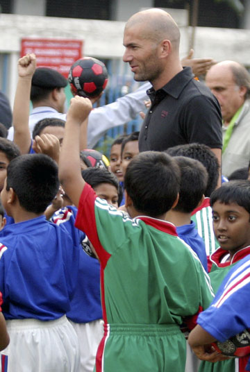 French soccer star Zinedine Zidane is surrounded by young players at the Bangladesh football federation in Dhaka, November 7, 2006. Zidane received a rousing welcome when he played football with children in a dusty Bangladeshi village on Tuesday. (Reuters)