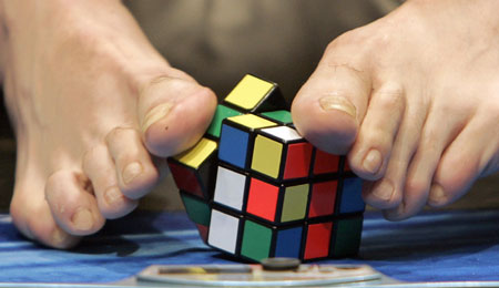 A competitor solves the Rubik's cube using his feet during the finals of the Rubik's Cube World Championship in Budapest October 7, 2007. (Reuters)