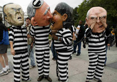 Demonstrators dressed as (L-R) Secretary of Defense Donald Rumsfeld, US President George W. Bush....