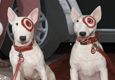Bullseye (L), a Bull Terrier featured in Target Corporation's commercial campaigns, sits next to its wax...