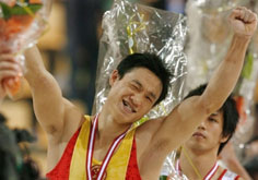 Gold medallist Yang Wei of China blinks with his eye to his supporters during the podium ceremony for the men's...