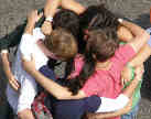 團(tuán)體類體育項目比賽開始前,各隊成員通常都會圍成一圈,把手臂搭在身邊隊友的肩膀上,集體呼喊勵志口號來振奮精神。這樣的集體行為英語里叫g(shù)roup hug。