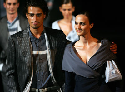 Models display creations as part of Giorgio Armani's Spring/Summer 2007 men's collection during Milan Fashion Week June 28, 2006.