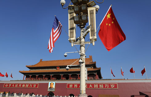 National flags of China and the US are hung up on the lamp posts in front of the Tian'anmen Rostrum, Nov 8, 2017. US President Donald Trump starts his first state visit to China on Wednesday.