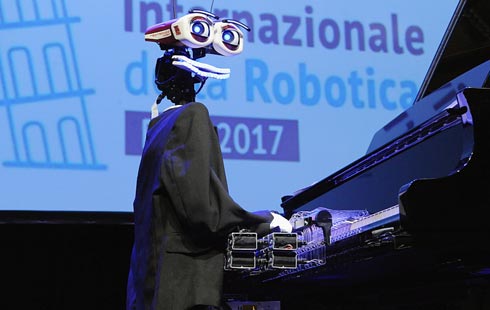 YuMi the humanoid robot, showed no signs of nerves on Tuesday as it raised its baton to conduct the Lucca Philharmonic orchestra alongside Italian tenor Andrea Bocelli.