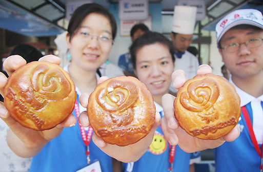 Paralympic volunteers showcase their self-made "volunteer moon-cakes" at the volunteers' desk at Xidan subway station in Beijing Sept. 11, 2008. Paralympians in Beijing will get a taste of China's Mid-Autumn Festival, which falls on the 15th day of the eighth lunar month. [Xinhua]