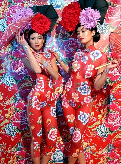 Two models covered in body-paint pose during the opening show for Australian Fashion Week in Sydney April 24, 2006. Over one hundred designers from Australia and Asia Pacific are presenting their designs. [Reuters]
