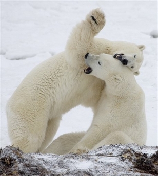 Polar bears spar with one another on the tundra near Churchill, Canada on Saturday Nov. 4, 2006. [AP]