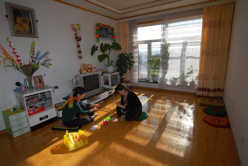 Liu Longyu (L) teaches about HIV/AIDS in a resident's home, who just returned from a visit to South Korea, in Yilan Town, Yanji City of Yanbian Prefecture, Northeast China's Jilin Province, November 20, 2006. Liu Longyu is the director of the Population and Family Planning Center in Yanji City, and is also the executive manager of Safe Mobility and HIV/AIDS Prevention, a joint program between the United Nations Development Programme (UNDP) and the National Population and Family Planning Commission. The program aims to reduce the risk of HIV/AIDS among mobile populations and cross border communities and has been conducted along China's northeastern border in the Aihui District of Heihe Prefecture in Heilongjiang, Yanji City, Yanbian Prefecture in Jilin, and Kuandian City in Dandong Prefecture in Liaoning since 2005. [Pan Songgang/China Population News]