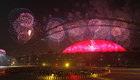 Fireworks explode over the Khalifa Stadium during the closing ceremony of the 15th Asian Games in Doha December 15, 2006.[Reuters]