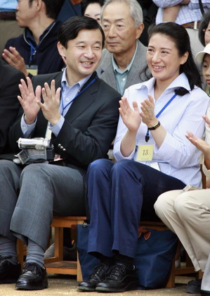 Japan's Crown Prince Naruhito (C) and Crown Princess Masako (R) clap as their daughter Princess Aiko (not pictured) dances during her kindergarten athletic festival in Tokyo October 6, 2007. [Agencies]