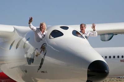 The photo-op was the public unveiling of the White Knight Two mothership before a crowd of engineers, dignitaries and space enthusiasts at the Mojave Air & Space Port in the high desert north of Los Angeles. The four-engine jet, with its 140-foot single wing, is an engineering marvel. The space between its twin fuselages is where SpaceShipTwo, the passenger rocket being built for Branson's Virgin Galactic, will be mounted. White Knight Two, billed as the world's largest all-carbon-composite airplane, is "one of the most beautiful and extraordinary aviation vehicles ever developed," Branson proclaimed. White Knight Two is the brainchild of Rutan, who made history in 2004 when his SpaceShipOne became the first private, manned craft to reach space. SpaceShipOne accomplished it with help from White Knight Two's smaller predecessor, White Knight. After winning $10 million for the feat, Rutan partnered with Branson, chairman of Virgin Group, to commercialize the prototype. White Knight Two's long-awaited rollout, a year after a deadly explosion rocked Rutan's test site, is the first tangible sign of progress toward making space tourism a reality. Despite the glitz surrounding the event, significant hurdles remain. The aircraft must undergo at least a year of rigorous flight tests starting in the fall. In addition, workers have to finish building SpaceShipTwo, which will be flown by two pilots and carry six passengers. Matthew Upchurch, 46, who reserved a future flight, said he felt goosebumps when he saw White Knight Two. "It was very emotional for me," he said. "I thought, 'Oh my God, we're getting closer.'" The mothership rollout also moved Rutan, who has made a career of designing unconventional aircraft. "Even though this is a pretty weird airplane, we all expect it fly very well," said Rutan, who traded his usual leather jacket for a white button-down shirt with a Virgin Galactic logo. Meanwhile, SpaceShipTwo, which is 70 percent complete, remained under wraps. It sat in a hangar several hundred feet away from White Knight Two shrouded in a black tarp. A sticker on it read "Coming Soon ... To A Spaceport Near You." In the history of spaceflight, most astronauts have been in government programs. In recent years, a handful of wealthy people have paid about $20 million each to ride Russian rockets to the international space station. Virgin Galactic envisions a future where space voyages will become as common as airplane travel. It wants to fly 500 people into space in the first year for $200,000 a head. If it succeeds, that would be on par with the same number of people who have gone up in 45 years of space travel. So far, more than 250 wannabe astronauts have paid the full amount or put down a deposit to fly with Virgin Galactic, but when they will float in zero gravity is unknown. Rutan has declined to release a schedule. Virgin Galactic stopped predicting after it said in a 2004 press release that flights could begin in 2007. Virgin Galactic renamed White Knight Two after Branson's mother, Eve. After the rollout, Branson and his mother popped open a bottle of Champagne next to the craft, which sports a decorative motif of a blond woman flying a Virgin flag. White Knight Two has a wingspan of 140 feet, about the same as a World War II B-29 Superfortress bomber. The mothership is designed to tuck SpaceShipTwo under the center of its wing and release it at 50,000 feet. After separation, SpaceShipTwo will fire its hybrid rocket and climb some 62 miles above Earth, the internationally recognized boundary of space. The spaceflight -- up and back down without circling the Earth -- will include about five minutes of weightlessness. The total trip, from White Knight Two's takeoff to SpaceShipTwo's unpowered landing, will last about 2 1/2 hours. Monday's unveiling was bittersweet for Rutan's company, Scaled Composites LLC. A year ago, three technicians were killed in an explosion while testing SpaceShipTwo's propellant system. Scaled, which was since bought by Northrop Grumman Corp., held a ceremony last week in honor of the fallen workers. |