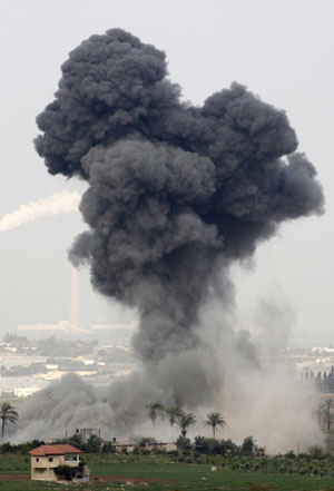 Smoke rises after an Israeli air strike in the northern Gaza Strip December 29, 2008. Israeli aircraft attacked Hamas targets in the Gaza Strip for a third day on Monday and militants launched a fatal rocket attack on Israel in defiance of an offensive that has killed more than 300 Palestinians. [Agencies]
