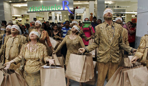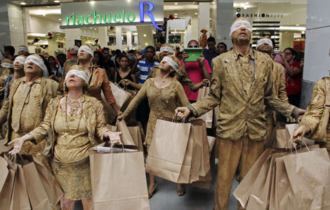 Students from the School of Communication and Art of the University of Sao Paulo perform a skit titled "Blind Ones" as a protest against consumerism inside a shopping mall of Natal, capital of Rio Grande do Norte state, December 9, 2013. The group plans to take the protest to cities in Europe and North America in 2014. [Photo/Agencies]