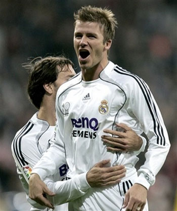 Real Madrid's David Beckham, right, is congratulated by Ruud Van Nistelrooy, after Beckham scored against Ecija during their second leg, fourth round Copa del Rey soccer match at the Bernabeu stadium in Madrid, Thursday, Nov. 9, 2006. [AP]