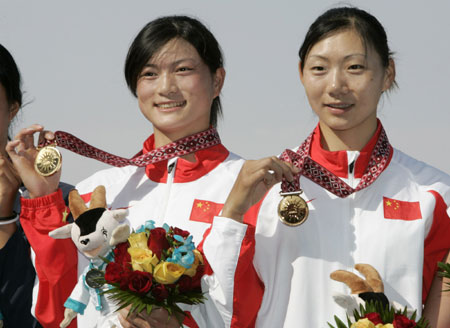 China's Tian Liang (L) and Li Qin show their gold medals in the women's double sculls rowing competition final at the 15th Asian Games in Doha December 6, 2006.[Reuters]