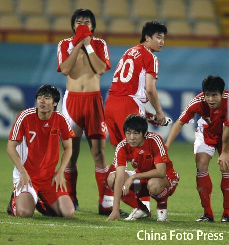 Chinese team members reacts after losingthe men's quarter-final soccer match against Iran at the 15th Asian Games in Doha December 9, 2006. [CFP]