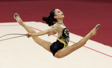 Ding Yidan of China competes with a rope during the rhythmic gymnastics women's individual all-around final at the 15th Asian Games in Doha December 10, 2006. [Reuters]