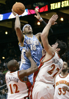 Anthony (15) shoots over Atlanta Hawks guard Speedy Claxton (12) and