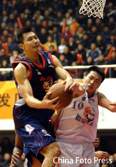 Top guns from the two sides, Yi Jianlian(L) and Liu Xiangpeng, fiercely clash under the hook in a 15th round game of CBA on Friday. With Liu's four three-pointers and the game's highest 20 points, Liaoning beat Guangdong 87-82. [China Foto Press]