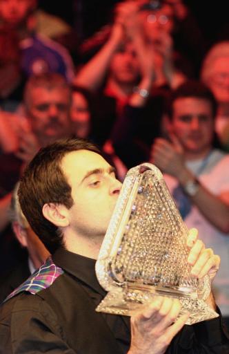 Ronnie O'Sullivan kisses his trophy after winning his third Snooker British