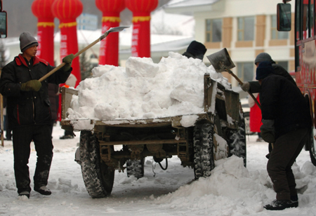 Winter Asiad workers are clearing up the firn around the Beida Lake Skiing Site to avoid the following events affected by the snowy weather in Jilin,northeast China's Jilin Province Jan.30,2007.[Xinhua]