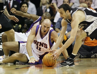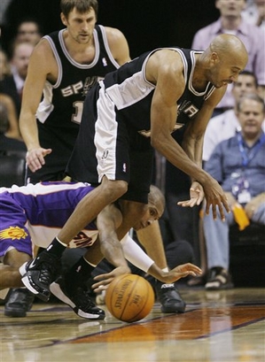 After going 3-for-17 on 3s, the Spurs made three in a row, two by Ginobili, to slice the lead to 71-69 8:05 from the end. Thomas' three-point play and James Jones' layup -- both baskets on assists from Nash -- increased the lead to 79-71 with 5:18 to go. The Spurs came back again. Finley sank a 3-pointer, then Nash fouled Ginobili on a 3-point attempt. He made all three, and San Antonio finally tied it at 79 when Parker made a 17-footer with 2:29 to go. The Spurs had to scramble to get past 30 by halftime, shooting 33 percent. Duncan scored 12 in the first half, but he had to work against the defense of Thomas. With the crowd booing every Spurs possession, the Phoenix went on a 20-2 run to open a 24-11 lead on Thomas' two free throws with 1:50 to go in the first. |