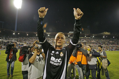 Real Madrid's David Beckham celebrates at the end of their Spanish