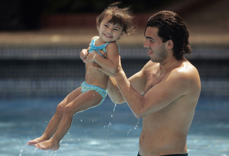 Argentina striker Carlos Tevez plays with his daughter Florencia at