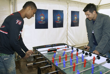 Austrian U-20 players Rubin Okotie (L) and Markus Katzer play some tabletop football for photographers during a Euro 2008 promotion day in Vienna September 29, 2007. [Reuters]