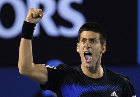 Serbia's Novak Djokovic shouts as he pumps his fist during his men's final match against France's Jo-Wilfried Tsonga at the Australian Open tennis tournament in Melbourne January 27, 2008. The 20-year-old Serbian captured his first Grand Slam event title 4-6, 6-4, 6-3, 7-6 (7-2). [Agencies]