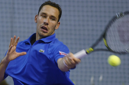 France's Michael Llodra returns the ball to Romania's Andrei Pavel during their Davis Cup World Group first round tennis match in Sibiu, about 300km (186 miles) northwest of Bucharest, February 10, 2008. [Agencies]