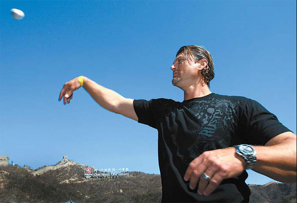 San Diego Padres pitcher Trevor Hoffman throws a ball to his teammate as they visit the Great Wall with the Beijing Olympic logo on display yesterday. The Padres will play the Los Angeles Dodgers on Saturday and Sunday at Wukesong Baseball Field, the venue for the 2008 Beijing Games. [Agencies]