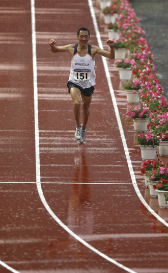 BEIJING -- Mongolia's Serod Batochir beat China's Li Zhuhong to win the Good Luck Beijing 2008 marathon men's race, which finished at the National Stadium, known as Bird's Nest, on raining Sunday morning.