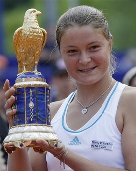 Russia's Dinara Safina displays the Golden Falcon trophy after winning her match against Russia's Elena Dementieva at the final of the Qatar Telecom German Open tennis tournament in Berlin, Sunday, May 11, 2008. Safina won 3-6 6-2, 6-2. [Agencies]