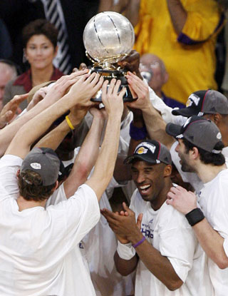 Kobe Bryant orchestrated the recovery with a towering display as the Lakers came from 17 points behind early in the second half to clinch the best-of-seven Western Conference finals 4-1. The All-Star guard, the NBA's Most Valuable Player, top-scored with 39 points as Los Angeles won their eighth consecutive home playoff game this post-season. Bryant also registered three rebounds and three assists while forward Lamar Odom contributed 13 points and Spanish center Pau Gasol 12, along with a career playoff-high 19 rebounds. Spurs guard Tony Parker led the way with 23 points for the defending champions who have clinched four NBA titles in the last nine years. "This is a dream come true, a dream come true," an elated Bryant said in a courtside television interview after the Lakers were presented with the Western Conference trophy. "It is such a blessing to share this with a group of guys, who are like brothers. It's such an unbelievable feeling. It's the answer to a prayer. "We knew we could play better and the first half was tough for us. They caught us off guard but we cut the deficit to a manageable game by halftime. Then we came out in the second half and put our foot on the gas. "And we ain't done yet," Bryant added, referring to the NBA championship finals where the Lakers will meet either the Boston Celtics or the Detroit Pistons. REAL SEASON "We play for one thing and one thing only, and that is championships. This is big, big stuff for us and we are all really proud of what we have accomplished. But now the real season starts." The Lakers made a surprisingly lacklustre start as the Spurs dominated the first quarter, Michael Finley pouring in two three-pointers to put the defending champions 28-15 ahead. San Antonio stretched their lead to 17 points early in the second period before reserve Jordan Farmar sparked a brief Lakers fightback with a 6-0 solo burst. A twisting drive to the basket for a lay-up cut the deficit to 33-22 and the capacity crowd at the Staples Center, stunned into silence moments earlier, erupted in a cacophony of noise. The inspirational Bryant, with loud chants of "MVP, MVP" ringing in his ears, shot four out of six from the floor before the Lakers closed the first half just 48-42 behind. Urged on by an energised crowd including Hollywood actors Jack Nicholson, Denzel Washington and Cameron Diaz, the home team raised the tempo after the break. A Bryant two-point jumper put the Lakers ahead 61-59 late in the third quarter before he set up a stunning three-pointer by Vladimir Radmanovic on the buzzer for a 64-63 lead' Bryant, who helped the Lakers win three consecutive NBA titles from 2000-02, dominated the final period by scoring 17 of his 39 points as the older and much more experienced Spurs players ran out of steam. "He was unbelievable again," Spurs forward Manu Ginobili said of Bryant. "When his team couldn't score he just took over and made some crazy shots. He's the best player in the league."