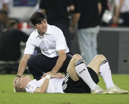Germany's coach Joachim Loew (top) comforts Bastian Schweinsteiger after their team lost to Spain in the Euro 2008 final soccer match at Ernst Happel Stadium in Vienna, June 29, 2008. [Agencies]
