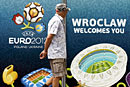 A worker makes the final touches on flags at the city stadium in Wroclaw, June 7, 2012, on the eve of the Euro 2012 soccer match between Russia and Czech Republic.