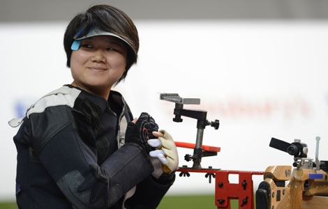Shooting down the first gold of the London Paralympics in wheelchair on Thursday, Chinese veteran markswoman Zhang Cuiping broke the 10-year-old world record with nine shots out of the final 10 above 10.3 points.