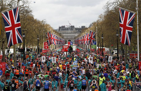 Judd Trump, right, of England in action as China's Ding Junhui, left, stands by during the second round of match at the world snooker championship in Shefield, England, April 25, 2016. [Photo/Xinhua] |