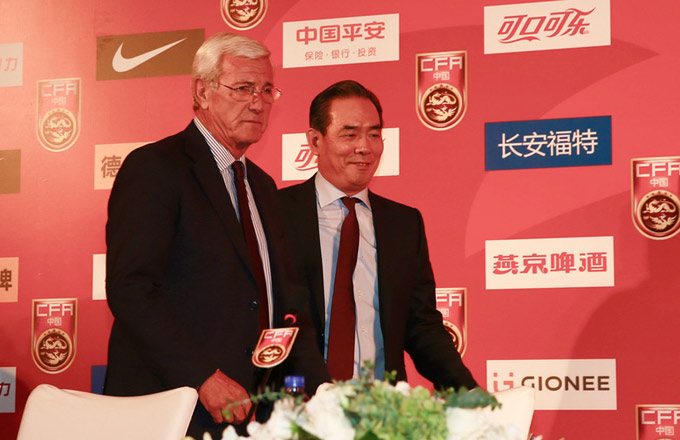 Marcello Lippi, newly-appointed head coach of the Chinese national football team, accompanied with China Football Association (CFA) President Cai Zhenhua, attended the first news conference in Beijing on Friday.