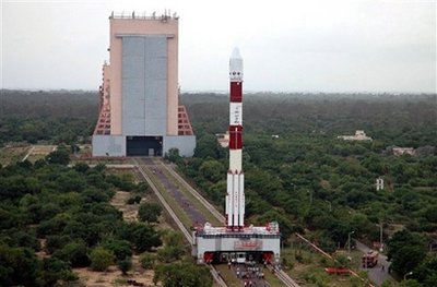 In this undated photo provided by the Indian Space Research Organization, Chandrayaan-1, India's maiden lunar mission, is taken to the launch pad in this undated photo at the Satish Dhawan Space Centre in Sriharikota, about 100 kilometers (63 miles) north of Chennai, India. [Agencies]