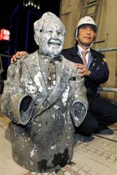 "He was apparently found standing upright, which is fitting, because although he was a nice man he could also be very strict and demanding," said Sumeo Yokakawa, a spokeswoman at the chain's Tokyo headquarters. She said the statue was taken from a nearby KFC restaurant and tossed in the river as part of a celebration by baseball fans in 1985, the year Osaka's baseball team, the Hanshin Tigers, won the national championship. Local fans thought the Colonel bore a resemblance to Randy Bass, a bearded power hitter and first baseman from the US who played for the team at the time. Fans often jump into the murky river to celebrate the team's successes, but there has been little to celebrate in recent years. Many fans feel the team has been plagued by the "curse of Colonel Sanders" since his effigy was submerged in 1985. It has failed to win a national championship since, although it did win its division in 2003. The upper half of the statue was found Tuesday in Osaka's Dotonburi River during construction work to build a new walkway, according to city official Hideo Yuko. His legs and right hand were found Wednesday morning.