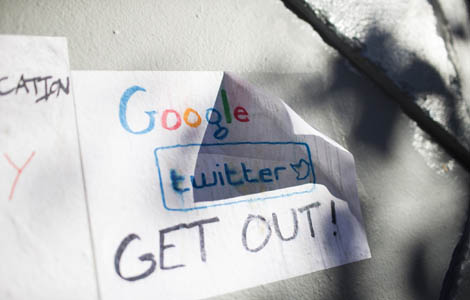 Signs in opposition of technology companies are seen in San Francisco, California December 9, 2013. A Google Inc commuter bus was blocked in San Francisco's Mission district for about a half hour Monday morning, highlighting many residents' growing concern that an influx of affluent technology workers is driving up costs in the city. [Photo/Agencies] |