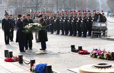 Chinese President Xi Jinping (C, front) lays a wreath of flowers at the Tomb of the Unknown Soldier in Paris, France, March 27, 2014.