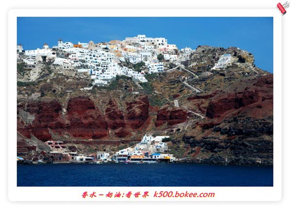 當(dāng)圣托里尼島出現(xiàn)在眼前的時候,大家不禁發(fā)出陣陣驚嘆。從我們的角度看,整個島嶼就好象一座橫亙在海面上的綿延山脈,褐色的陡峭懸崖頂端層層建造著白墻藍(lán)頂?shù)拿利愇萆幔笃孥E一樣。雖然,此前我已經(jīng)在腦海中無數(shù)次想象過這番景象,但是親眼見到的時候,我還是被深深震撼了。